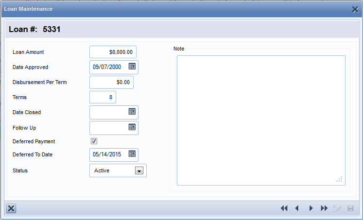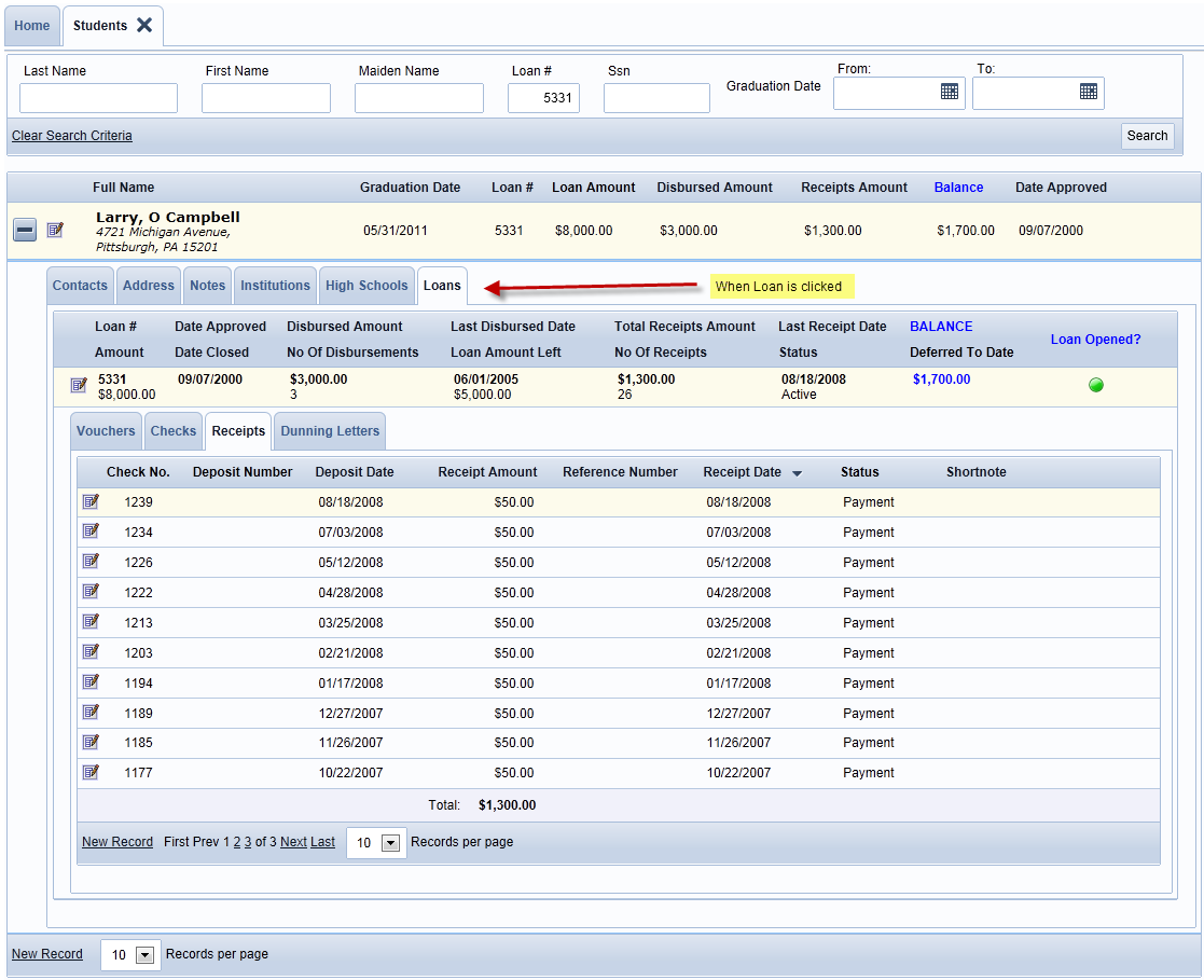 When you track down any status of each loan, you actually can make a decision of how to pursue further with each individual. When clicking the left icon near the loan amount you can zoom right into the loan record. See the loan form below.
