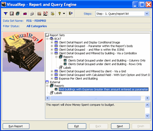 Developers can incorporate VisualRep into a Visual FoxPro application by calling the report via VisualRep with only one line of code. The developer could either expose the VisualRep interface to the user or provide its own.